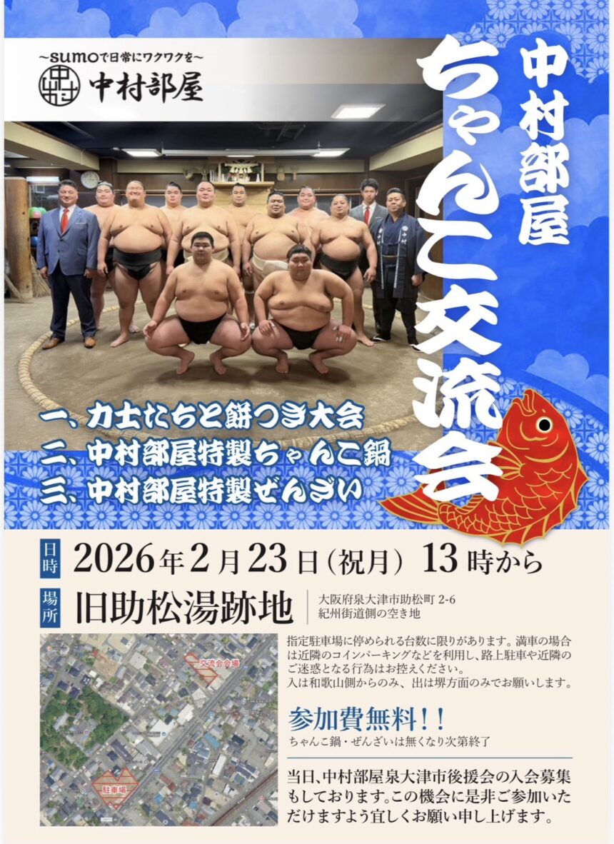 大相撲の春場所(大阪場所)に向けて、中村部屋さんが泉大津市内に拠点を構えることになりました。